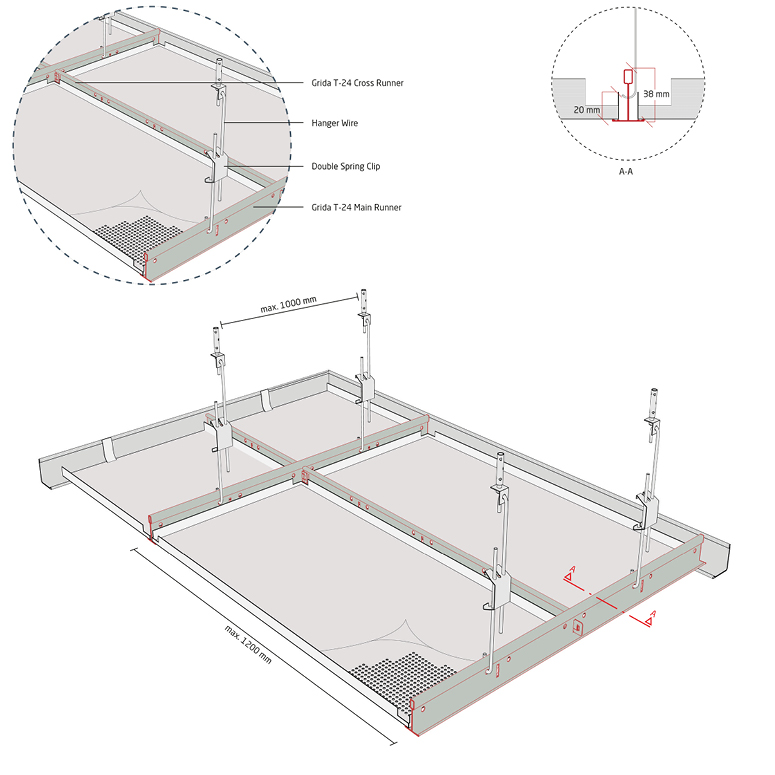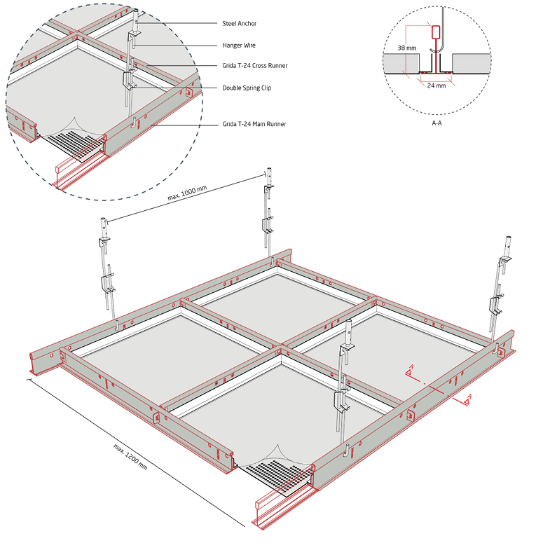 Integra Lay-in Deep-Tegular System wordt gebruikt met T-24 veersysteem. Met dit systeem zijn de rasterprofielen zichtbaar. De Tegular-inlegpanelen vallen 12 mm lager dan het T24-systeem. De panelen kunnen op maat worden ontworpen en geproduceerd, inclusief de mogelijkheid van verschillende hoogte afmetingen.Integra Lay-in Tegular System wordt gebruikt met T-24 veersystemen. Met dit systeem zijn de plafondroosters zichtbaar. De Tegular-inlegpanelen vallen 8 mm lager dan het T-24-systeem. De panelen kunnen op maat worden ontworpen en geproduceerd, inclusief de mogelijkheid van verschillende hoogte afmetingen.